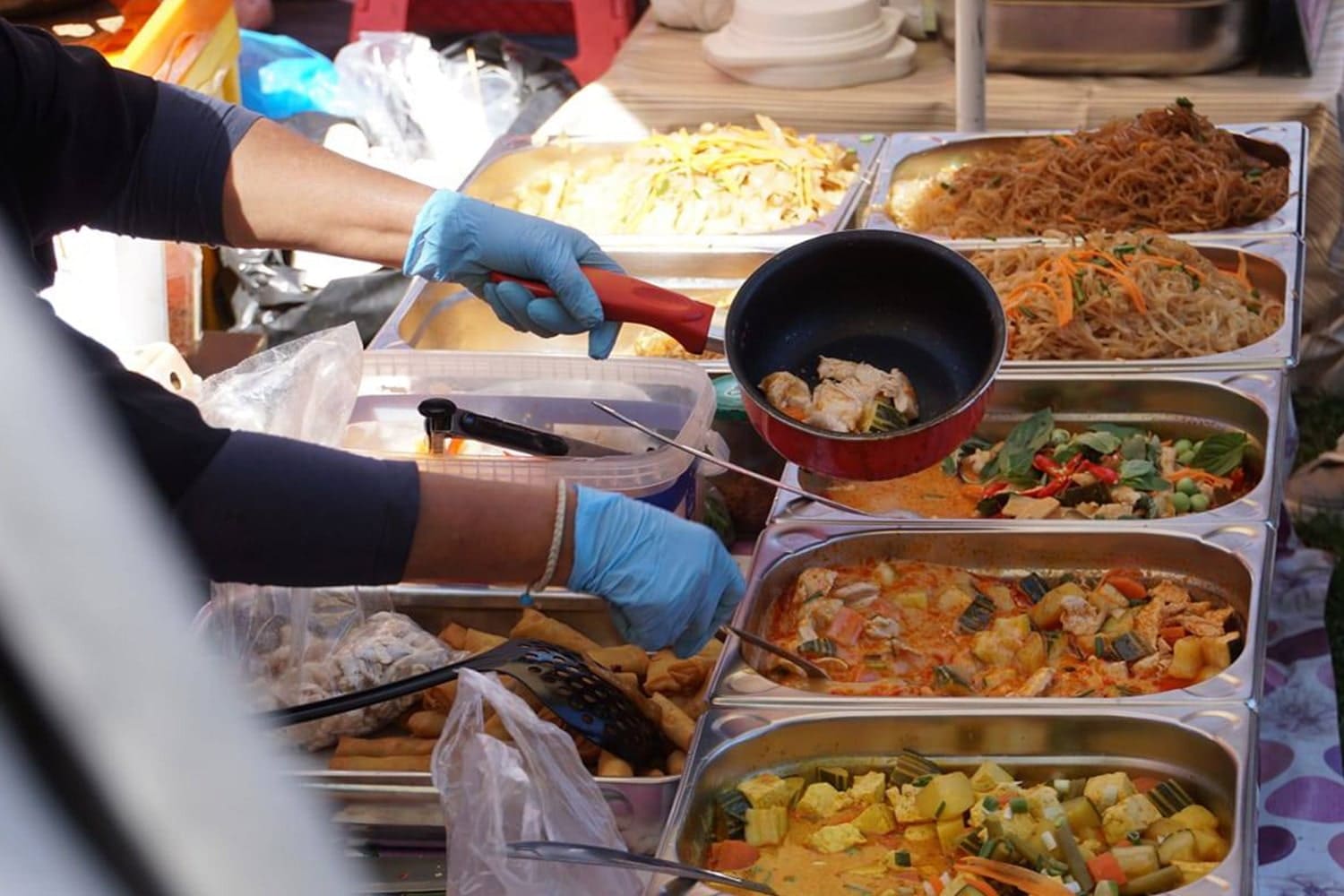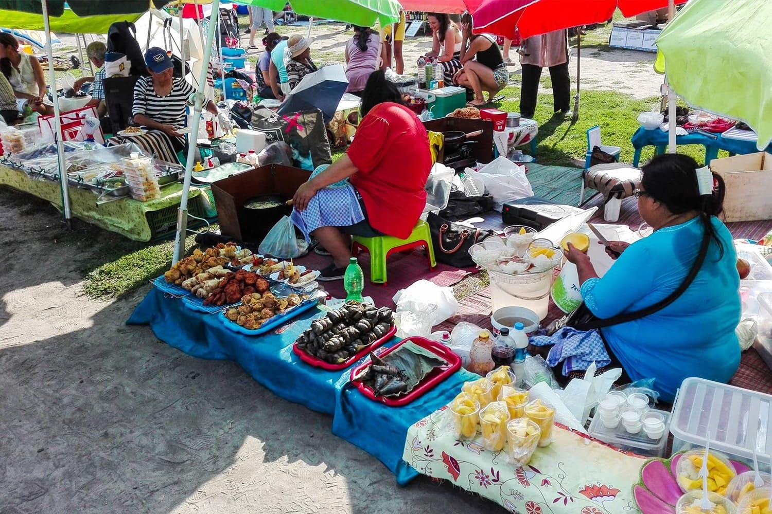 Unter bunten Sonnenschirmen und auf Bastmatten präsentierten sich Thailänderinnen und andere Asiaten, die köstliches thailändisches Essen zubereiteten und anboten. Es gab eine Fülle von Gerüchen, die einem das Wasser im Mund zusammenlaufen ließen. Ein Besuch erforderte etwas Geld, um sich durch die Vielfalt der Speisen und Getränke zu probieren. Die Auswahl war riesig, von frischem Papayasalat bis zu erfrischender Kokosmilch direkt aus der Nuss.