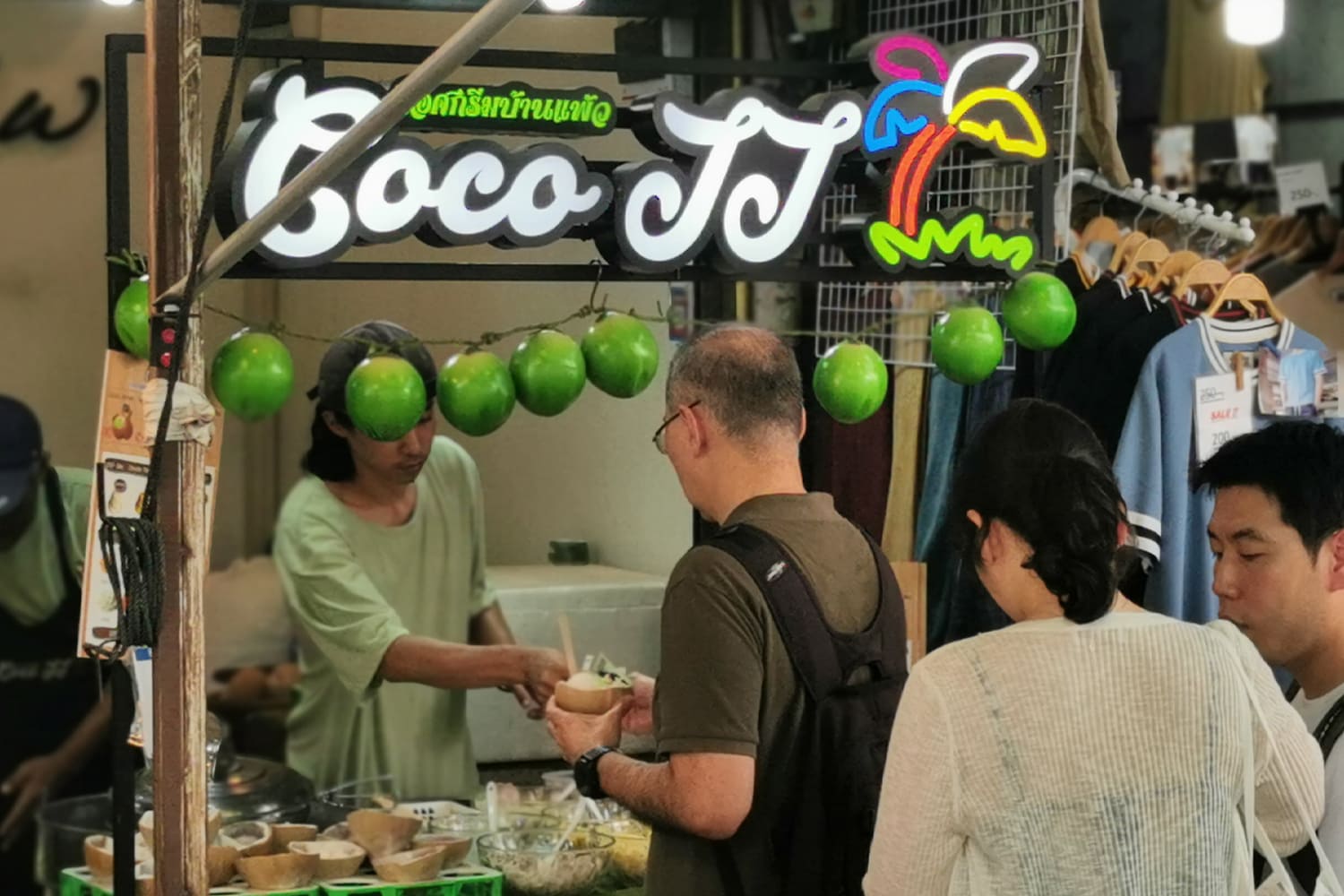 Der Chatuchak-Markt ist bekannt für sein vielfältiges Angebot an Street Food und Snacks. Probiere „Khanom Buang“, thailändische Crêpes, die mit Kokosnuss, Ei und Zucker gefüllt sind, oder „Sai Oua“, eine würzige thailändische Wurst aus dem Norden des Landes. Erfrische dich mit einem Kokosnusswasser direkt aus der Frucht oder einem frischen Fruchtsmoothie.