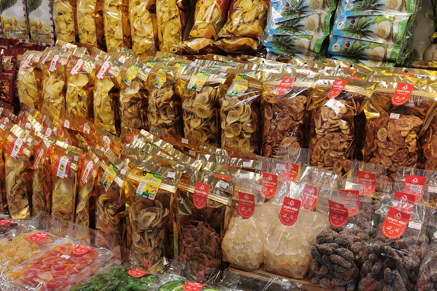 - Getrocknete Snacks und Süßigkeiten: Eine große Auswahl an getrockneten Früchten, Nüssen und traditionellen thailändischen Süßigkeiten wartet darauf, von dir entdeckt zu werden. Perfekt als Mitbringsel oder zum Naschen vor Ort. Die glänzenden Verpackungen und die Vielfalt der Farben und Formen machen es schwer, nicht sofort alles probieren zu wollen.