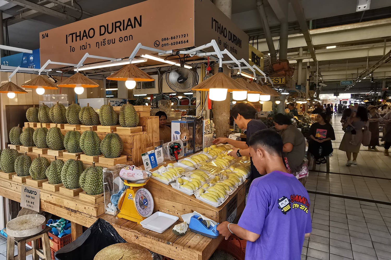 - Frische Früchte: Die Obststände sind eine wahre Augenweide. Du entdeckst leuchtend gelbe Mangos, deren süßer Duft in der Luft liegt, stachelige Durianfrüchte, die ihren charakteristischen Geruch verströmen, und saftige Mangostanen, die in ihrer tiefvioletten Schale glänzen. Jede Frucht scheint perfekt ausgewählt und sorgfältig platziert zu sein, um den Käufern ins Auge zu springen.