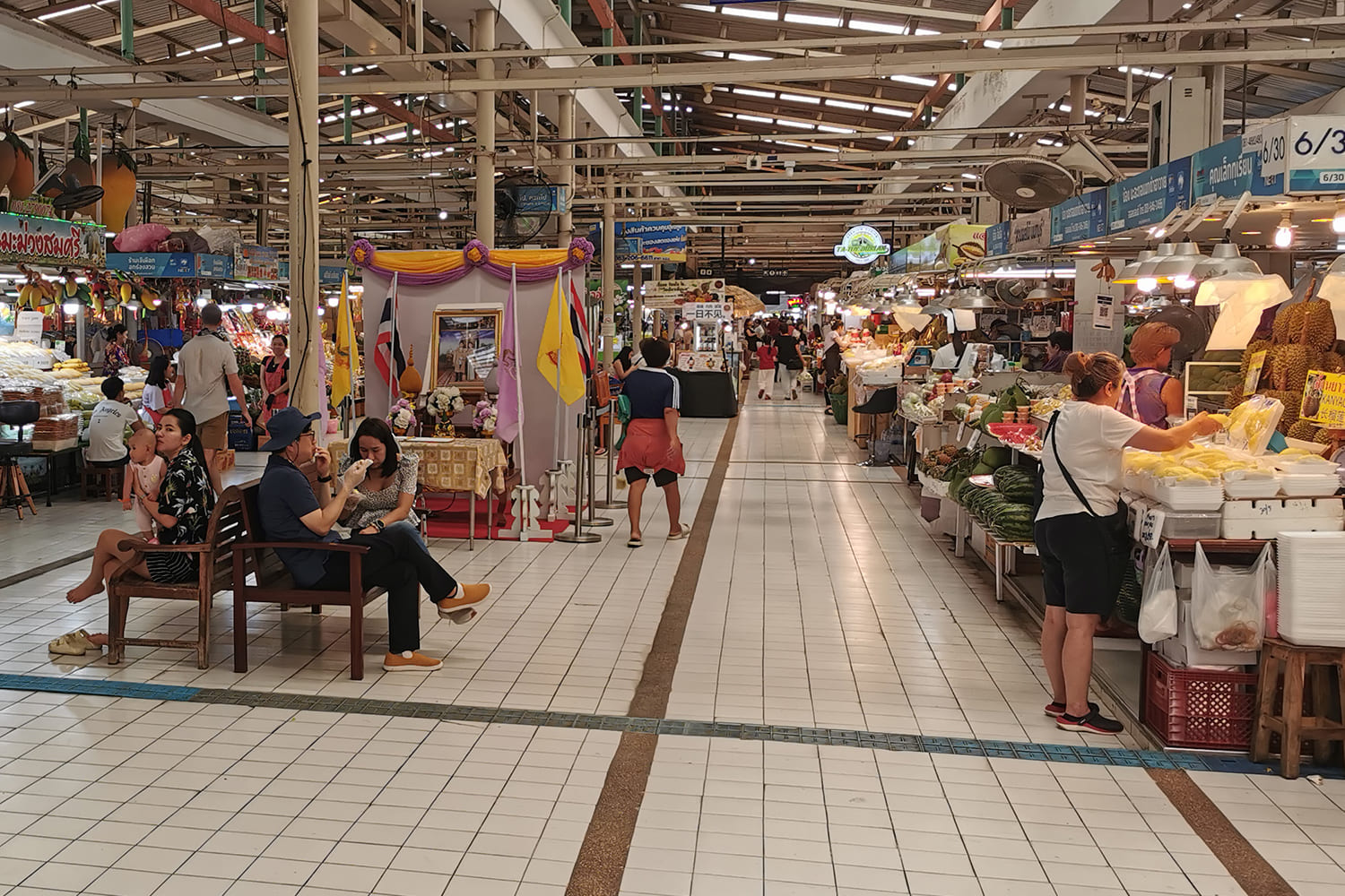 Neben dem Einkaufen kannst du auf dem Markt auch direkt vor Ort essen. Zahlreiche Stände bieten frisch zubereitete Gerichte an, die du unbedingt probieren solltest. Von scharfen Currys über frische Som Tam (Papaya-Salat) bis hin zu süßen Mango Sticky Rice – hier findest du alles, was das Herz begehrt. Setze dich auf einen der kleinen Holzhocker und genieße dein Essen inmitten des bunten Treibens. Während du deine Mahlzeit genießt, kannst du das geschäftige Treiben um dich herum beobachten – Kinder, die neugierig die Stände erkunden, Verkäufer, die eifrig ihre Produkte anpreisen, und Touristen, die fasziniert von der Vielfalt der angebotenen Waren sind.