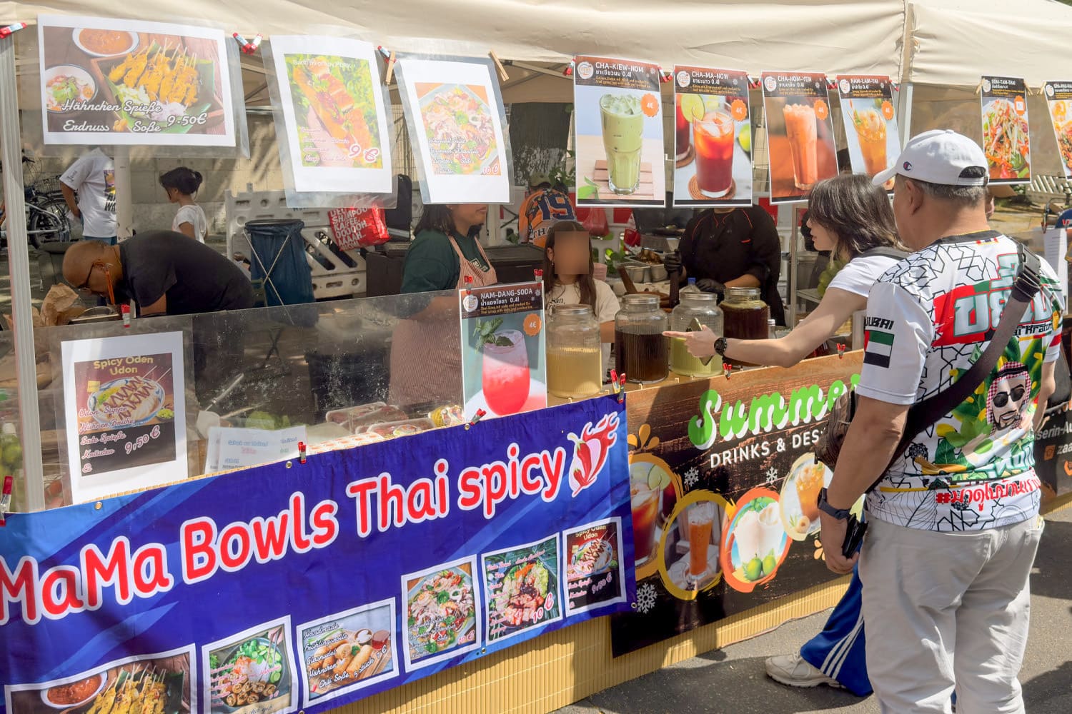 Genieße eine beeindruckende Bandbreite an Speisen. Probiere Thai Pork Jerky, Kap Moo oder besondere Delikatessen wie frittierte Insekten. Die Stände werden von asiatischen Gastronomen betrieben, die dir nicht nur thailändische Spezialitäten, sondern auch andere kulinarische Highlights aus ganz Asien präsentieren.