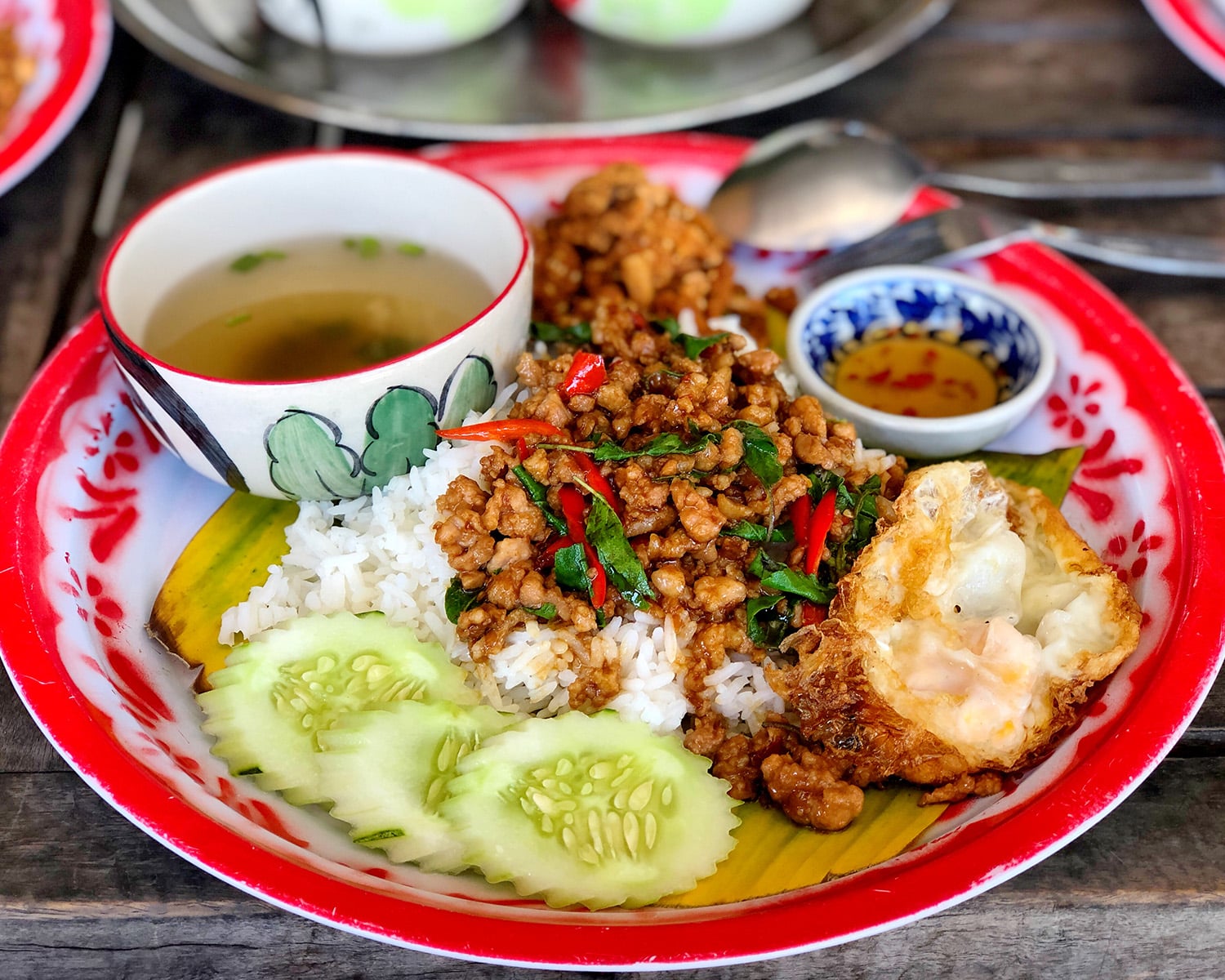 Mein absolutes Lieblingsgericht und ein traditionelles Thai Gericht: Pad Krapao. Diese Köstlichkeit wird aus Hackfleisch (gewöhnlicherweise Rind oder Schwein, selten Hühnchen) und gebratenem Basilikum zubereitet. Wie bei den meisten Gerichten in Thailand gibt es auch hier verschiedene Varianten. Unser Tipp: Mit Spiegelei: Aroi Mak Mak!