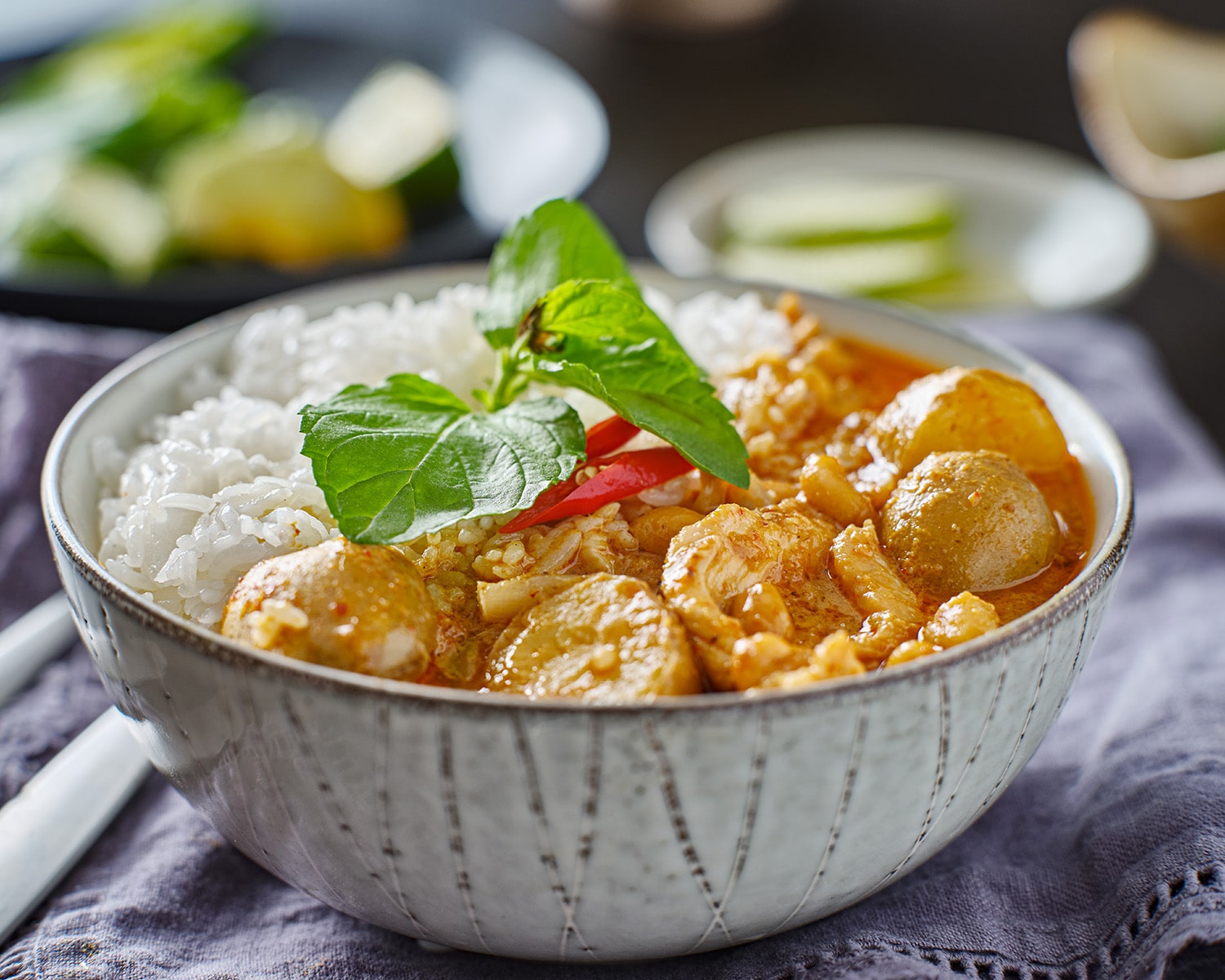 Massaman Curry ist ein traditionelles Thai-Curry, das in den allermeisten Restaurants und oft auch auf den Märkten angeboten wird. Die würzige Curry-Sauce ist unglaublich lecker und besteht aus roten Schalotten, Kartoffeln und Hühnerfleisch . Natürlich wird alles kräftig mit den typischen Thai-Gerichten gewürzt und mit Koriander angereichert. Wenn es ein Gericht gibt, dass Du auf keinen Fall verpassen solltest auf deinem Trip durch Thailand, dann dieses hier! Vor allem in Bangkok wird das Massaman Curry besonders gerne gegessen.