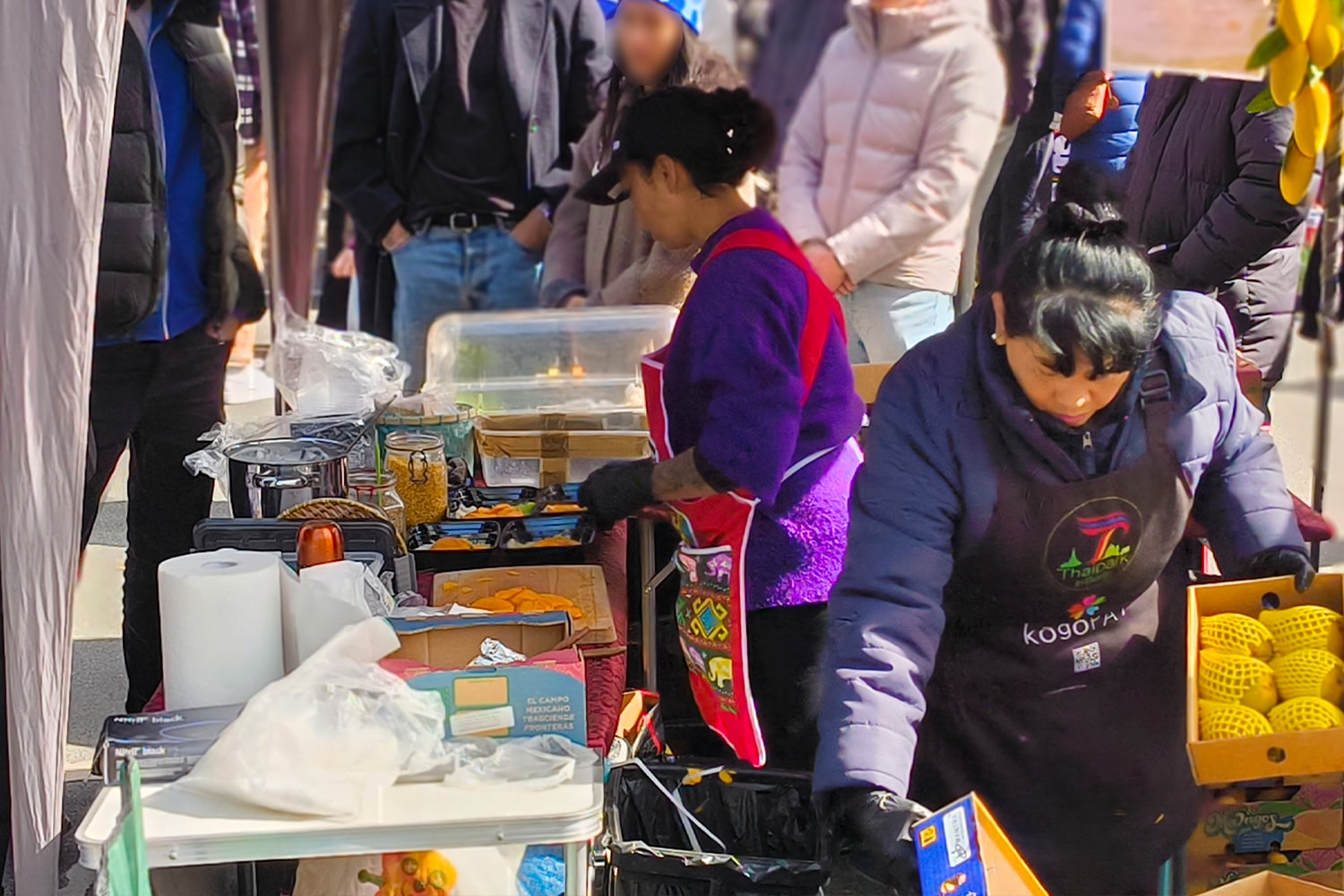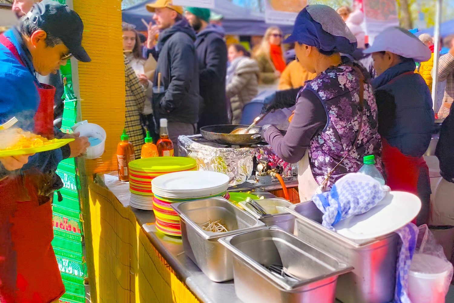 Schon beim Näherkommen merken wir: Wir sind nicht allein. Der Duft von gegrilltem Fleisch, frischem Koriander und knusprigen Frühlingsrollen zieht uns magisch an. Es ist voll, laut, lebendig – und fühlt sich an wie Urlaub mitten in Berlin.