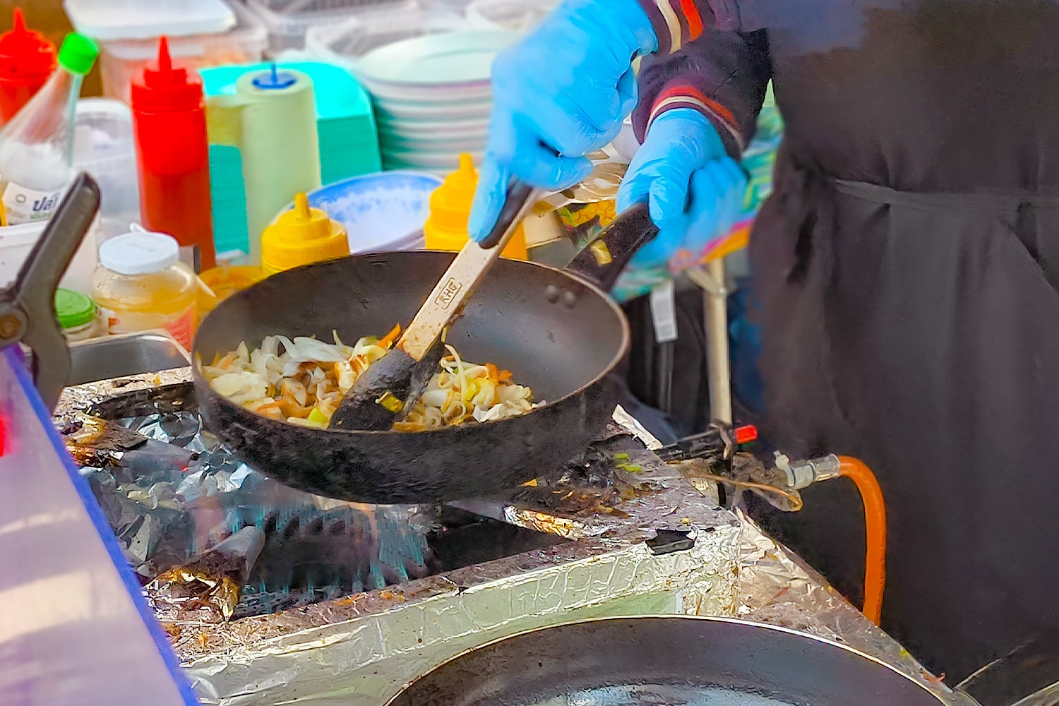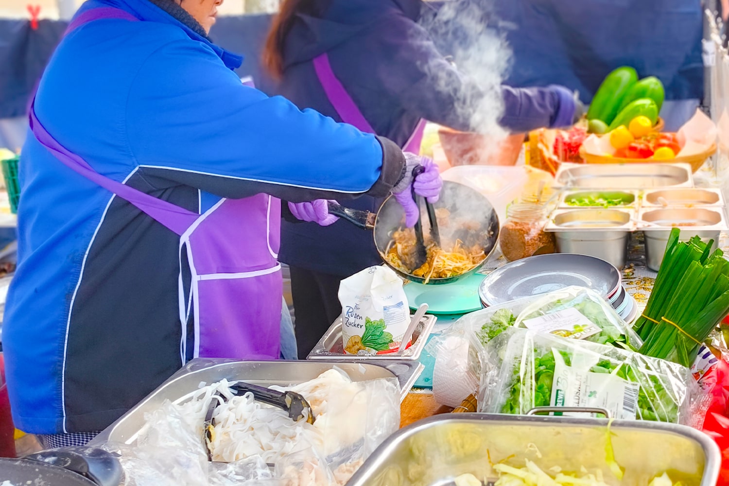 Das bestätigt auch gleich unser erster Stopp: Eine Wok-Pfanne zischt auf offener Flamme, blaue Handschuhe wirbeln Reisnudeln durch die Luft, als ginge es um die letzte Runde bei „Kitchen Impossible“. Willkommen zurück, Streetfood-Zauber!