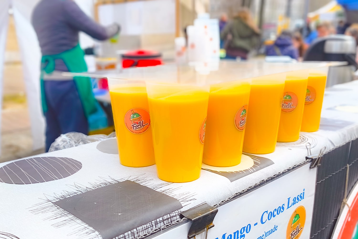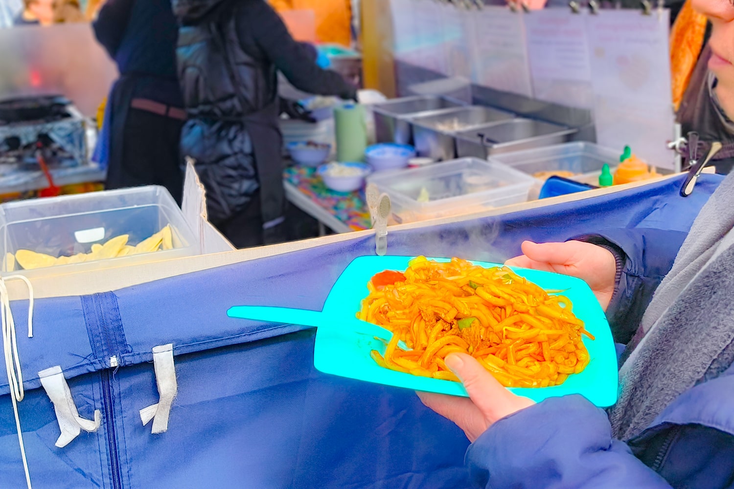 Entlang der Württembergischen Straße – also direkt zwischen den Food-Ständen – stehen überall Tische mit Sitzbänken. Mega praktisch für alle, die keine Decke dabei haben oder ihre Suppe nicht auf dem Schoß balancieren wollen.