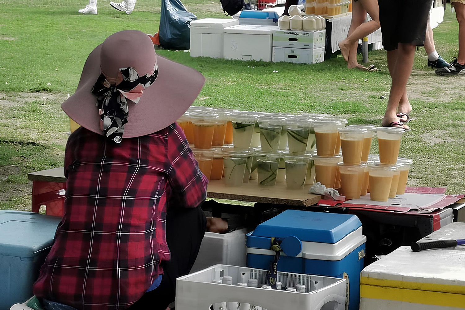 Im Thaipark, auf kleinen Hockern oder ausgelegten Decken, fanden sich zahlreiche asiatische Frauen aus Thailand, Vietnam oder Korea unter bunten Sonnenschirmen ein, um ihre selbstgemachten, authentischen Gerichte anzubieten. Traditionelle Aromen und exotische Speisen prägten die Szenerie, wobei vor allem thailändische Frauen die meisten Speisen zubereiteten. In jüngerer Zeit gesellten sich jedoch auch Köchinnen und Köche aus Korea, Vietnam und China dazu. Die Atmosphäre war so fesselnd, dass man schnell vergaß, sich inmitten von Berlin, Deutschland, zu befinden. Vielmehr fühlte es sich an, als befände man sich für einen Moment in einem spontanen Kurzurlaub in Thailand. Das Besondere an diesem Ort war die unverkennbare Authentizität, wenn die Menschen aus Thailand und den angrenzenden Ländern sich ans Kochen machten. Hier konnte man zweifellos echte, traditionelle thailändische Küche genießen, wie man sie in den üblichen Thai-Restaurants nur selten findet. Die gesamte Umgebung versprühte ein Flair, das unweigerlich an die lebhaften Märkte Asiens erinnerte, wo jeden Tag Getränke und Streetfood angeboten wurden.