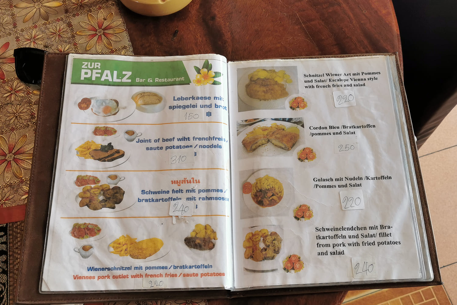Mitten in einer lebhaften Seitengasse von Udon Thani findest du das Restaurant Zur Pfalz, eine charmante Mischung aus thailändischem Ambiente und deutscher Küche. Schon beim Betreten fällt dir auf, dass das Restaurant eher an eine gemütliche Kneipe erinnert, als an ein traditionelles deutsches Gasthaus. Die Wände sind schlicht gehalten, ohne Fotos oder Dekorationen, die an Deutschland erinnern. Stattdessen bietet die Einrichtung einen rustikalen Charme, der typisch für viele thailändische Lokale ist.